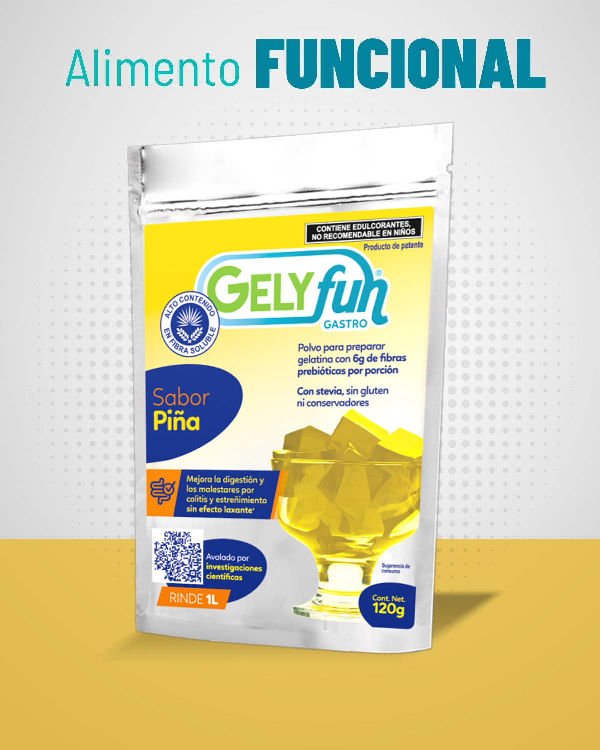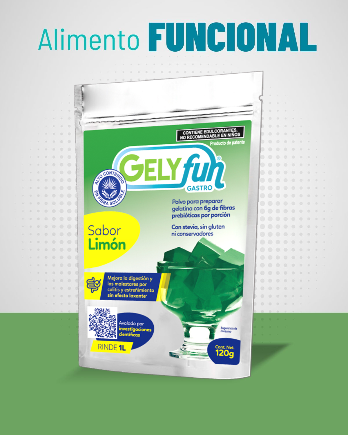 Gelyfun ® gastro es una gelatina en polvo adicionada con mezcla de fibras prebióticas de origen natural. Cada bolsa rinde para preparar un litro de gelatina, la cual debe de repartirse en 10 porciones ( o bien 10 vasos de 100 mL cada uno). El consumo recomendado es de 1 a 2 porciones al día. Cada porción aporta solo 30 Kcal y 6 g de fibra, lo que equivale a consumir medio kilo de lechuga, 3 manzanas o 4 rebanadas de pan integral.1